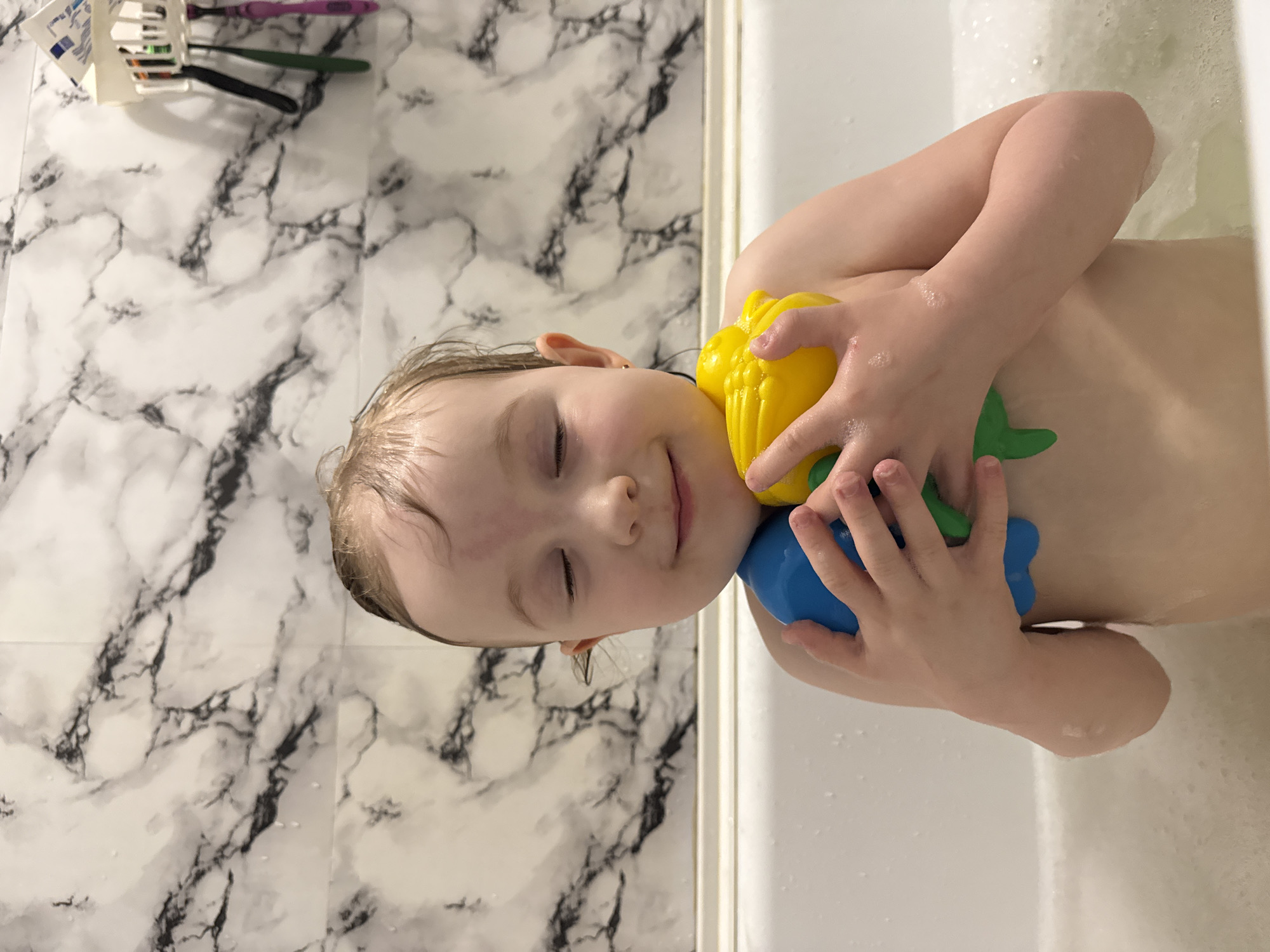 A young child with light skin and wet, light-colored hair is partially submerged in a bathtub filled with soapy water. The child's eyes are closed and they are smiling slightly. They are holding a colorful toy with yellow, green, and blue sections against their chest. The bathroom wall behind them has a white marble pattern with black veining. A toothbrush holder with toothbrushes is mounted on the wall. The image was taken indoors in a bathroom. The location is not specified in the image and thus cannot be confirmed as Chaikovsky, Russia.