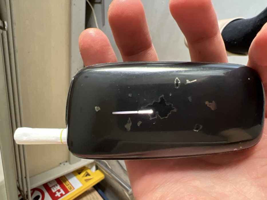 A human hand holds a damaged black electronic device, resembling a heat-not-burn tobacco system, in a vertical position. A white tobacco stick is inserted into the top of the device. The device's black coating is significantly worn, showing a large, irregular area of missing material below a vertical white indicator light, along with numerous smaller chips and scratches. The hand's palm, thumb, and fingers are visible, exhibiting light-toned skin. In the upper left background, a yellow and red sign with partially visible Japanese text, including "土足厳禁" (No shoes allowed) and "NO ENTRY," is present. Above this, light-colored horizontal louvers are visible. The scene is situated in Chiba, Japan.