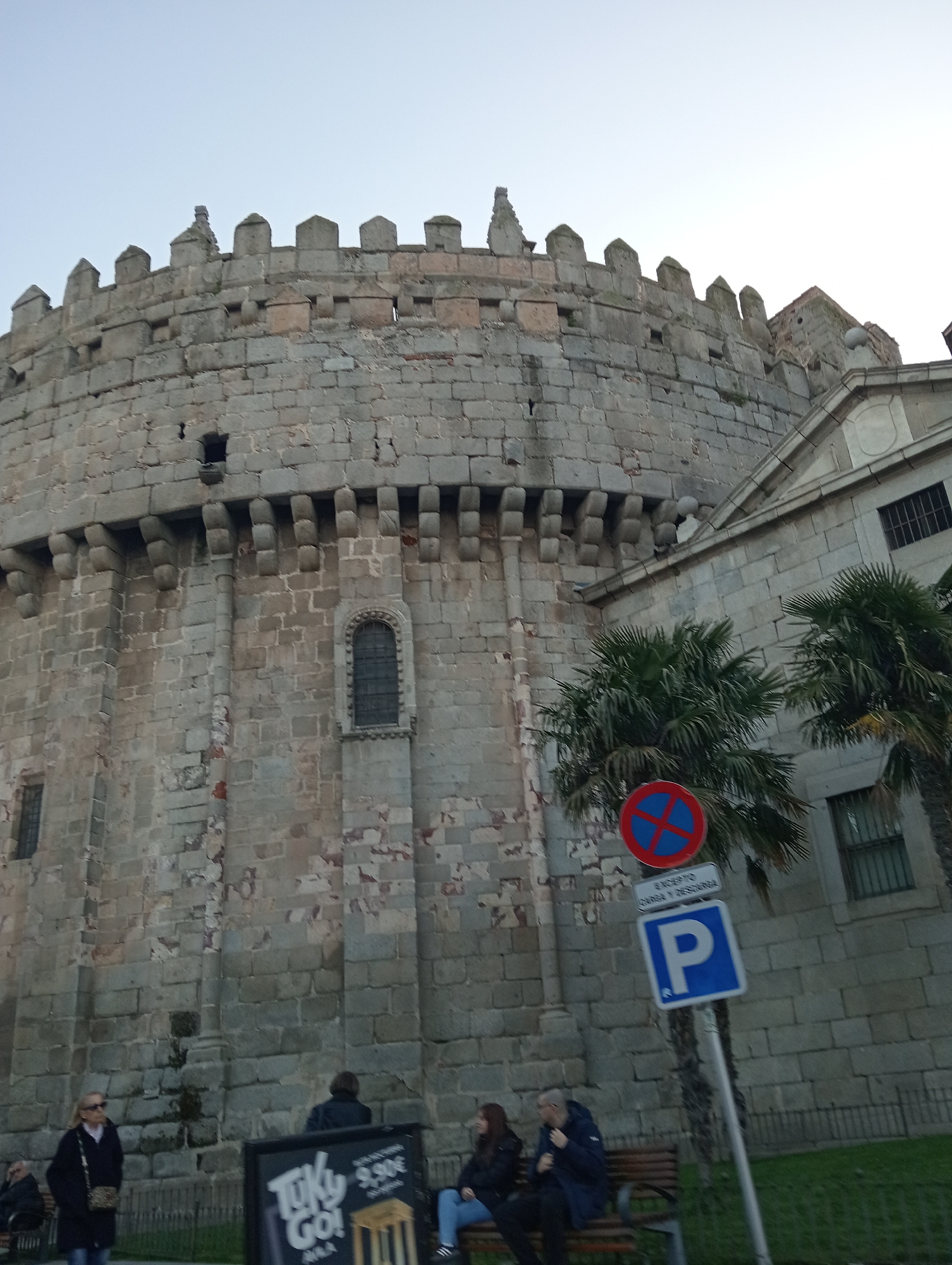 An outdoor, low-angle photograph depicts the formidable stone apse of the ÁVila Cathedral, integrated into the city wall of ÁVila, Spain. The massive, rounded structure, constructed from weathered gray and tan stone blocks, features crenellated battlements at its apex and a corbelled cornice below. An arched, gridded window with decorative stone framing and a smaller rectangular, barred window are visible on its facade. To the right, a lighter-colored stone building with a classical facade and barred windows adjoins the main structure. In the lower frame, five individuals are present. One person in a dark jacket stands on the left. Three people are seated on a dark brown park bench towards the right, appearing to be resting or conversing. A fifth person is partially visible seated further left. A black sandwich board sign displaying "TUKU GO!" and "9,90€" stands upright near the bench. Two green palm trees partially obscure the right-side building. A dark metal fence borders a strip of green grass at the base of the stone structures. A metal pole supports three traffic signs: a red circular 'No Stopping' sign with a blue 'X', a white rectangular sign reading 'EXCEPTO CARGA Y DESCARGA' (Except Loading and Unloading), and a blue square 'P' (Parking) sign. The sky is a uniform, light gray, suggesting an overcast day or twilight conditions.