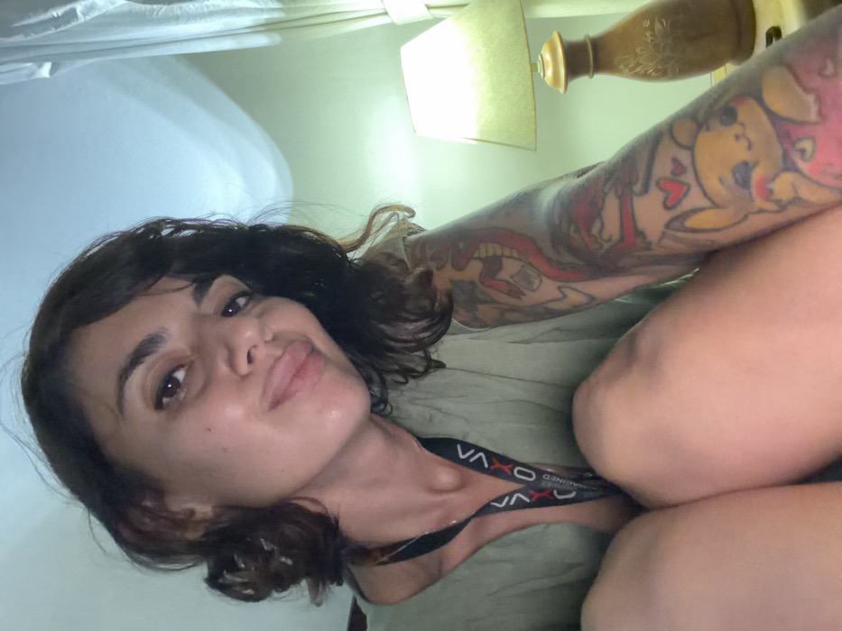 The image depicts a female individual in an indoor setting, identified as Bangle, Indonesia. The subject, with dark, wavy hair and brown eyes, is positioned facing the camera, slightly angled to her left. Her lips are subtly pursed, and she exhibits a faint smile. She wears a loose-fitting, light olive-green top. A black lanyard with white text, partially visible as "VAX IMAGINED" or similar, hangs around her neck. Her left arm is prominently tattooed, featuring a red and black snake-like design on the upper arm and a stylized yellow cartoon character resembling Pikachu, adorned with red hearts, on the forearm. Her knees and upper thighs are visible, suggesting a seated or crouched posture. In the background, to the right of the subject, a bedside lamp with a light green or beige fabric shade and a decorative wooden base is illuminated, casting a warm glow. Above the lamp, a translucent white fabric, possibly a curtain or mosquito net, is visible against a light-colored wall or ceiling.