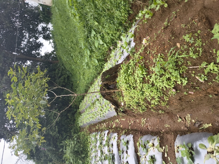This image depicts an agricultural field in An Khe Ward, Vietnam. The scene is dominated by parallel rows of cultivated land, each covered with dark plastic mulch through which numerous small, light green leafy plants are emerging. Between these mulched rows are narrow furrows of exposed dark brown soil, some containing scattered plant debris. Centrally positioned, a weathered, dark tree stump serves as the base for a slender young tree with a pale trunk and branches adorned with green leaves. To the right, a verdant, upward-sloping embankment is densely covered with various green foliage and weeds. The background reveals a line of mature trees against an overcast sky, with what appears to be an overhead utility line faintly visible traversing the upper-right portion of the frame. No individuals or animals are present, and no specific actions or interactions are depicted. The overall environment suggests a rural or semi-rural agricultural setting.