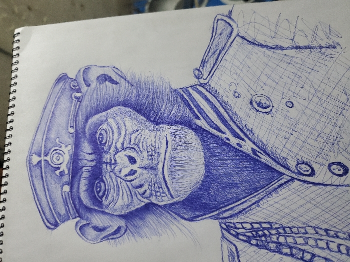 A detailed ballpoint pen drawing, rendered in blue ink, depicts the head and upper torso of a chimpanzee dressed in a military-style uniform