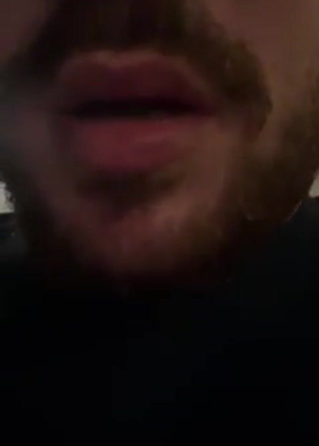 A close-up shot focuses on the lower portion of a person's face. The individual has a light-skinned complexion, and a partial view of their reddish-brown mustache and beard is visible. The person's mouth is open, revealing their teeth as they speak or vocalize sounds. They are wearing a dark-colored shirt. The background is indistinct.
