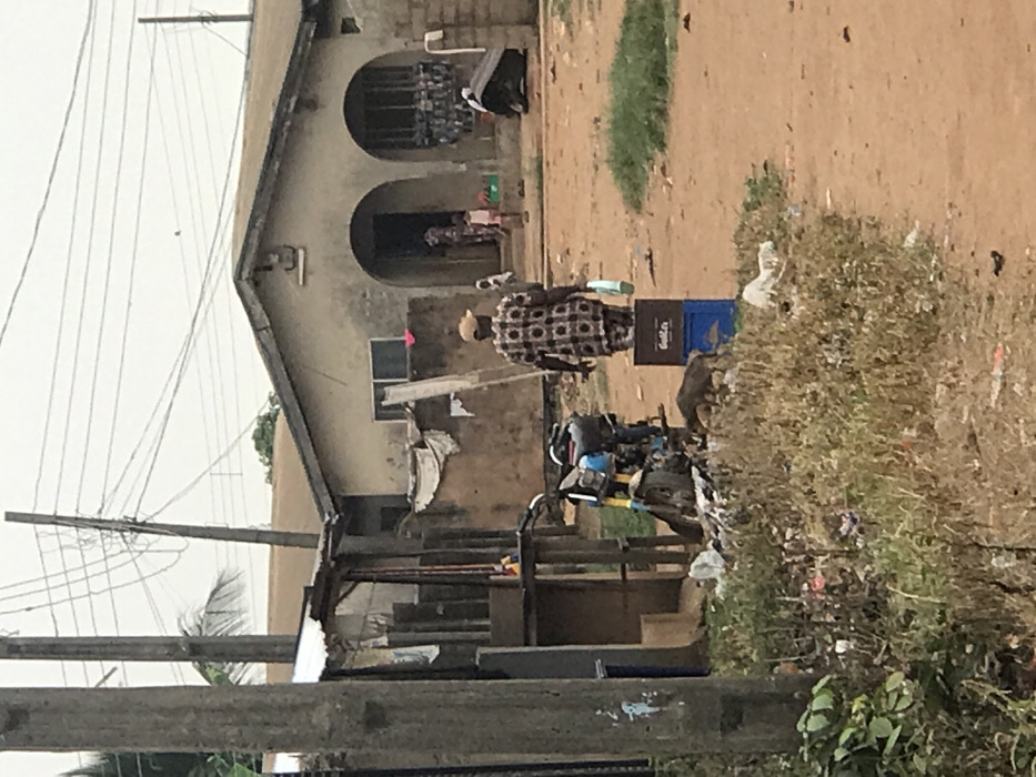A figure stands near a parked motorbike, possibly preparing for a ride. The individual is wearing a plaid shirt and a hat and is carrying a blue container. Nearby, a weathered building features arched windows. The background shows a sandy ground with patches of green vegetation. Power lines crisscross the sky near a concrete pole in the foreground.