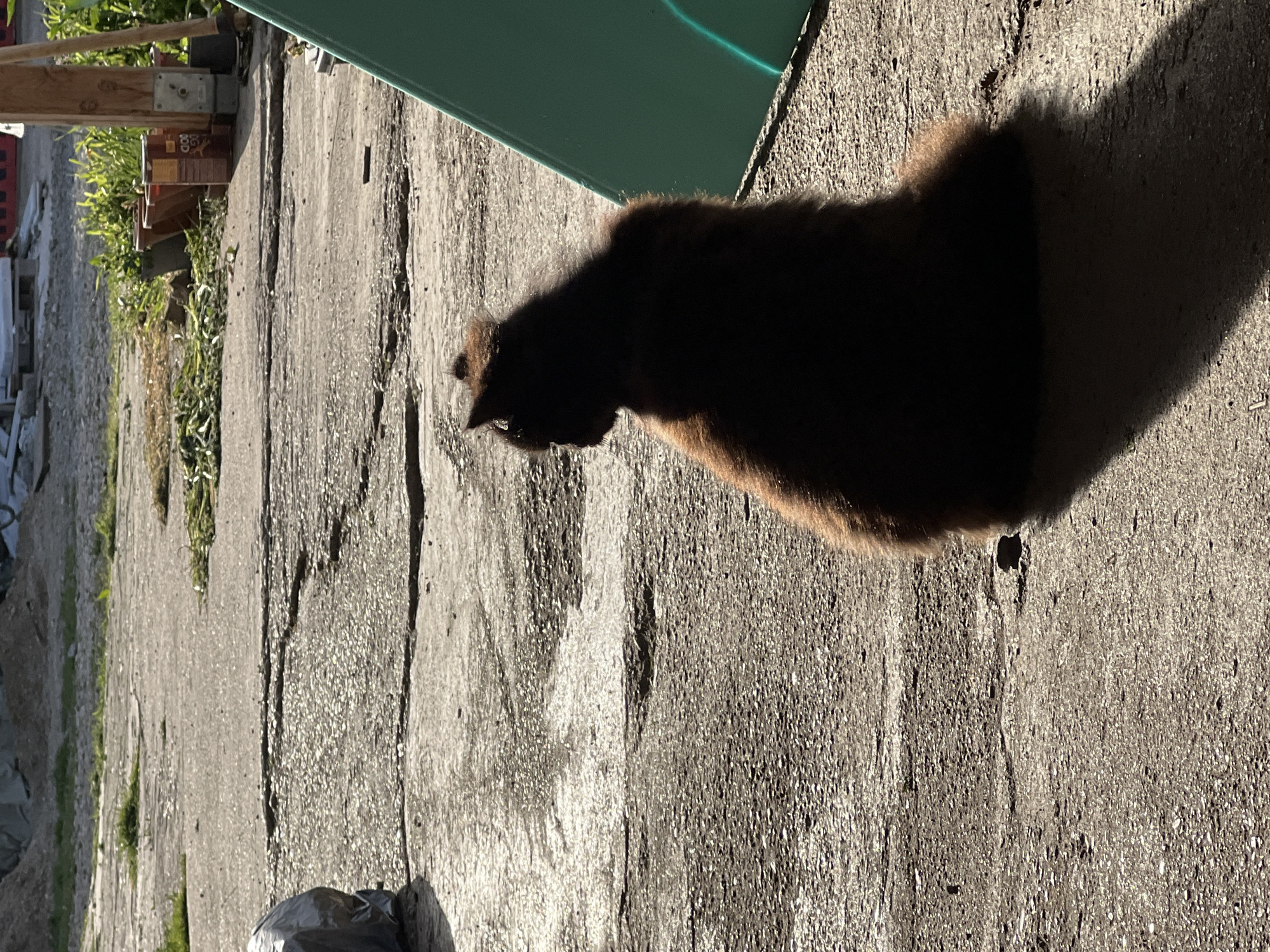 A photograph taken in Parvomaitsi, Bulgaria, displays a concrete surface with linear cracks running across it. A black cat is positioned on the concrete, casting a shadow. A green object is partially visible in the upper portion of the frame. To the left, there are plants and a collection of miscellaneous items. A dark, crumpled object sits at the bottom left. The lighting suggests a sunny day.