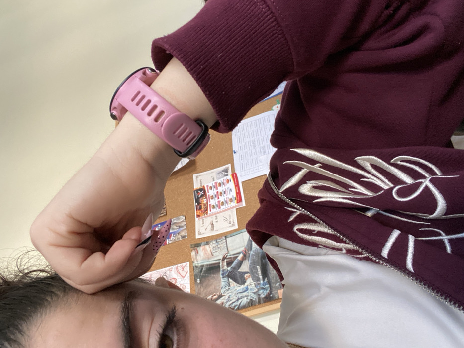 The image displays a close-up, first-person perspective of an individual indoors. The upper left quadrant features the left eye of the subject, with a brown iris and visible eyelashes. The subject's right hand rests on their forehead, obscuring the upper part of the face. The nails on the right hand are long, pointed, and decorated with a light purple base, black polka dots, and black stripes. A pink digital smartwatch with a black buckle is worn on the right wrist. The subject is wearing a white inner shirt, partially visible, layered with a dark maroon or burgundy zippered hoodie featuring prominent light-colored, possibly white or cream, embroidered script or ornate lettering on the front. A silver zipper is visible down the center of the hoodie. In the background, a cork board is affixed to a plain, light beige wall. Pinned to the cork board are multiple documents and images. These include a large vertical image of a person (male) wearing a denim jacket and jeans, seated, in the lower left section of the board. To the right of this, a rectangular paper with a food menu or advertisement is visible, displaying images of food items (e.g., burgers) and text, likely in Cyrillic script. Further right and below, another document resembling a table or grid with text, also possibly in Cyrillic, is pinned. A paper with a red, stylized leaf or floral pattern is visible in the upper left section of the cork board. The specific location within the city of Gabrovo, Bulgaria, is not discernible from the visual information provided in the image.