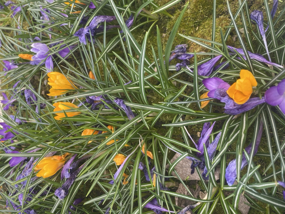 The scene, located in Unknown, Russia, presents a close-up, overhead perspective of ground vegetation. The dominant feature is a dense cluster of linear green foliage, each blade exhibiting a prominent central white stripe. Scattered throughout this foliage are crocus flowers in various states. Several vibrant yellow crocuses are observed in bloom, alongside a smaller number of fresh purple crocuses. Numerous withered purple petals and desiccated purple flower structures are interspersed among the green blades and on the underlying mossy ground. Fragmented orange petals are also visible. No human figures or man-made objects are present. No actions or interactions are depicted.