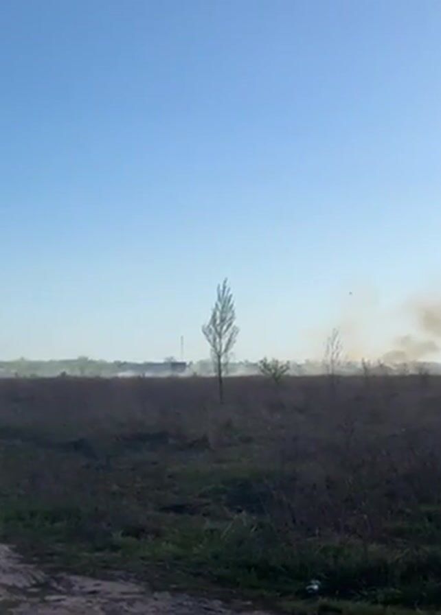 field with sparse vegetation, some small trees, and a distant treeline. In the background, large plumes of smoke rise into the sky. The sky is blue with some light cloud cover. The camera is mostly static, providing a wide view of the scene.