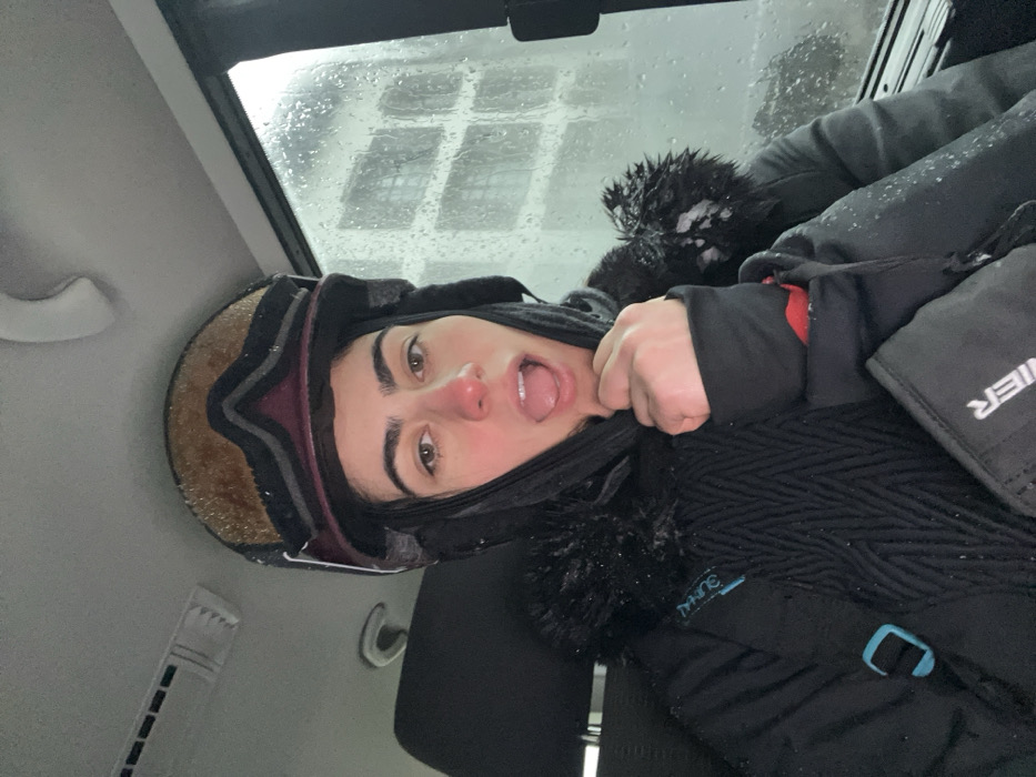 A female individual is depicted seated inside a vehicle in Breuil-Cervinia, Italy. She wears a dark ski helmet with gold-tinted goggles pushed onto its top, both exhibiting water droplets from precipitation. Her face is visible, showing a reddened nose and a playful expression with her tongue extended. She is dressed in a dark winter jacket featuring a faux fur collar and textured patterns, with visible white precipitation (likely snow or sleet) on the collar and shoulders. A light blue buckle is visible on the left chest area of the jacket. Her left hand, encased in a dark mitten or glove with a partial white logo, is raised towards her chin. The interior of the vehicle shows a grey headliner, a white grab handle, and a black headrest. The exterior environment, viewed through a rain-streaked window, reveals a light-colored, multi-story building with numerous windows, obscured by water droplets and general low visibility.