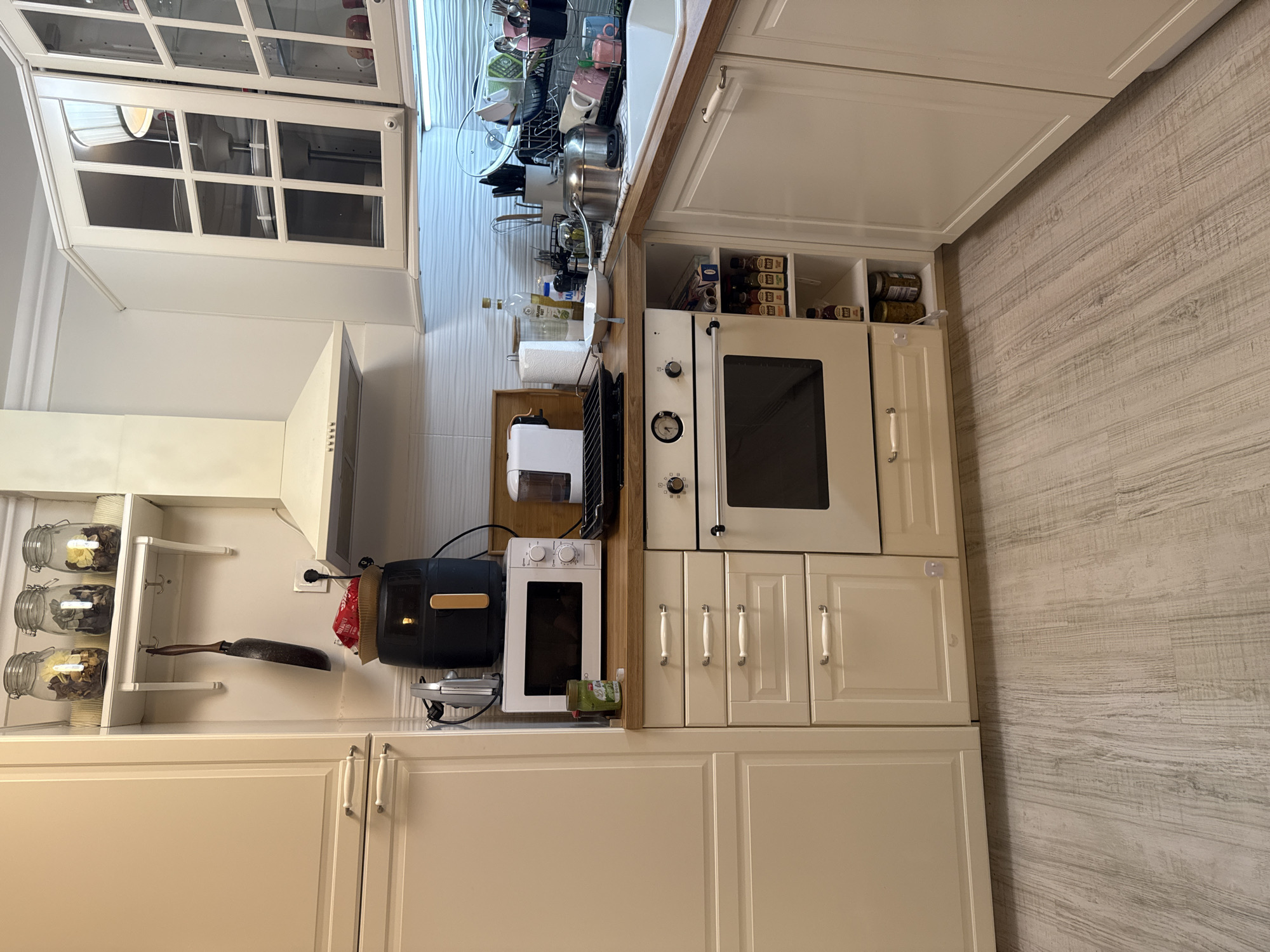 This image depicts a domestic kitchen located in Vratsa, Bulgaria. The scene is static, devoid of people, subjects, or active interactions. The kitchen features off-white, paneled cabinetry and appliances. The floor is covered with light grey, wood-grain laminate planks. The countertops are a light wood-tone. A horizontally ridged white tile backsplash is present above the counter surfaces. From left to right: On the far left, a tall, integrated cabinet unit with two doors featuring two white handles each. Adjacent to this, a stack of four drawers with identical white handles. On the countertop, a white microwave oven is positioned, with a black air fryer resting on top of it. A green jar, possibly containing pesto, is next to the microwave. To the right of these, a white toaster or small grill appliance is visible, followed by a black rectangular grill pan. A white paper towel roll is centered. Various bottles, including cooking oil, and several kitchen utensils in containers are arranged on the counter. A metal dish drying rack filled with colorful mugs, bowls, and plates stands next to a white, integrated sink. A large metal pot with a lid rests on a striped cloth to the left of the sink. Above the countertop: A white wall shelf holds three large glass jars containing dried decorative plant material. A black frying pan hangs from a hook below this shelf. A white range hood is positioned above the built-in oven area. To the right, an L-shaped upper cabinet unit features glass-paned doors, revealing plates and other kitchen items inside. Under-cabinet lighting illuminates the backsplash. Below the countertop: A white built-in oven with a circular timer and control knobs is installed. To its right, an open shelving unit contains rolls of aluminum foil on the upper shelf and several small bottles of condiments or spices on the lower shelf. A cabinet door with a white handle is located under the sink, and a child safety lock is visible on the lower left cabinet door adjacent to the oven.