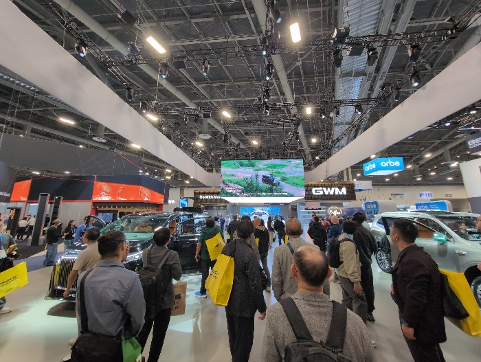 A crowded indoor exhibition features vehicles and numerous attendees. Several individuals are moving through the space, with some carrying bags. Overhead, a large screen displays video footage. Various company logos, including "GWM," are visible on signage and displays. The scene suggests an automotive or technology-focused trade show.