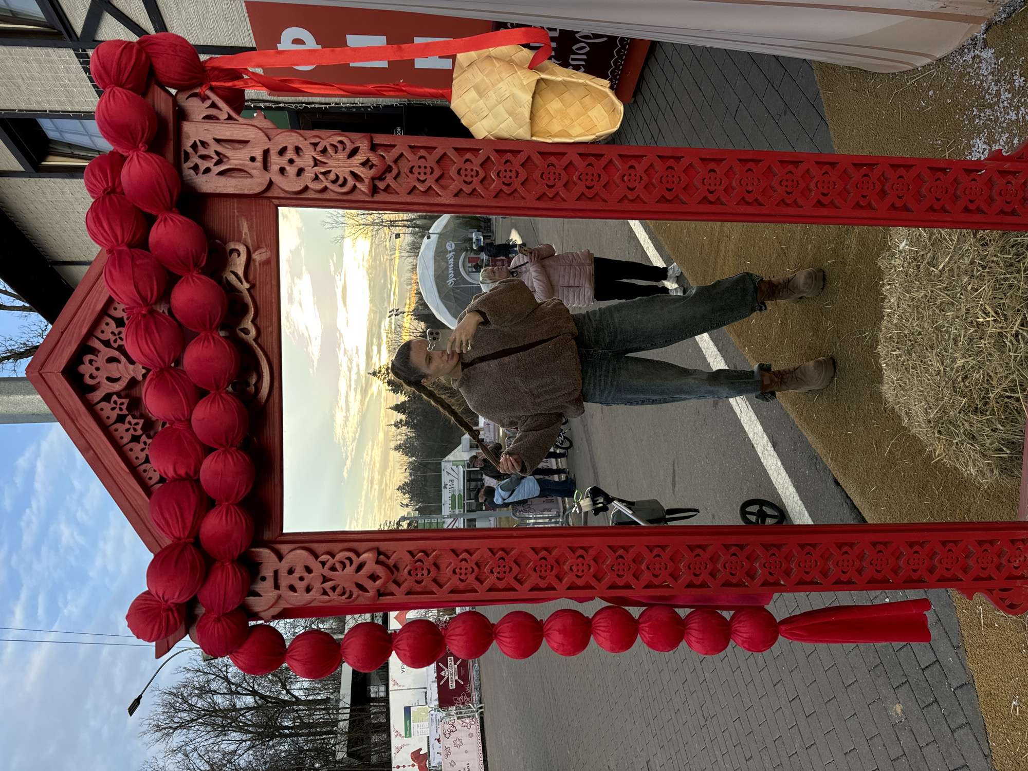 An outdoor scene in Odintsovo, Russia, depicts a young female taking a mirror selfie within a prominently featured, ornate red wooden frame. The frame, styled with traditional Russian folk art carvings, is adorned with a garland of red fabric balls along its top and left vertical edge. A light-colored woven bast shoe (lapti) hangs from a red ribbon attached to the upper right side of the frame. The female subject, visible in the mirror's reflection, stands centrally. She wears a brown faux-fur jacket, light blue jeans, and light brown combat boots. Her dark hair is styled in a single braid, which she holds with her right hand. She is holding a light-colored smartphone in her left hand, positioned to capture her reflection. The environment reflected in the mirror shows an overcast sky with hues of orange and yellow, indicating either sunrise or sunset. In the middle ground, a large white geodesic dome structure bearing the Russian text "ФУДМАРКЕТ" (FOODMARKET) is visible. Several other individuals are present in the background: an older woman in a pink puffer jacket and dark pants, holding a phone, stands behind the primary subject, and another person in a light blue vest is visible further back. A baby stroller is also visible near the paved ground. The surrounding area features bare trees, suggesting a colder season. The ground directly in front of the mirror frame is covered with a coarse, light brown mat, upon which hay is scattered. To the left of the frame, a paved surface is visible, consistent with the reflected background. To the right, a white sign with Russian text "МАЯКОВСКАЯ" is partially visible.