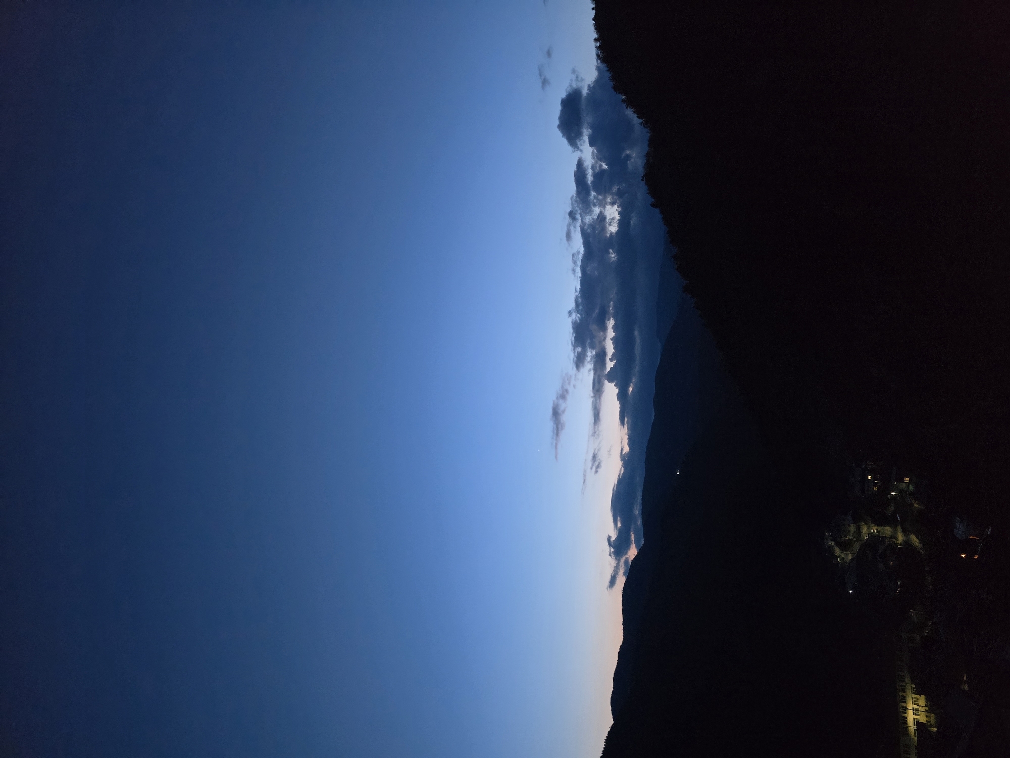 An elevated long shot captures the mountainous terrain surrounding Giovren, Bulgaria, at twilight or early night. The sky transitions from deep indigo overhead to a lighter blue-grey at the horizon. Scattered dark clouds are present, primarily on the right side of the frame, with a faint orange-pink glow near the distant horizon. A single bright point of light is visible in the upper central sky. The foreground and mid-ground are dominated by dark, silhouetted mountain ridges, indicative of dense forestation, especially on the right. Below the mountain slopes, the village of Giovren is visible, illuminated by numerous artificial lights. Streetlights define roads and paths, while individual buildings show interior illumination through windows. A prominent structure with multiple illuminated windows is situated in the lower-left section of the visible settlement. No individuals, specific actions, or interactions are discernible.