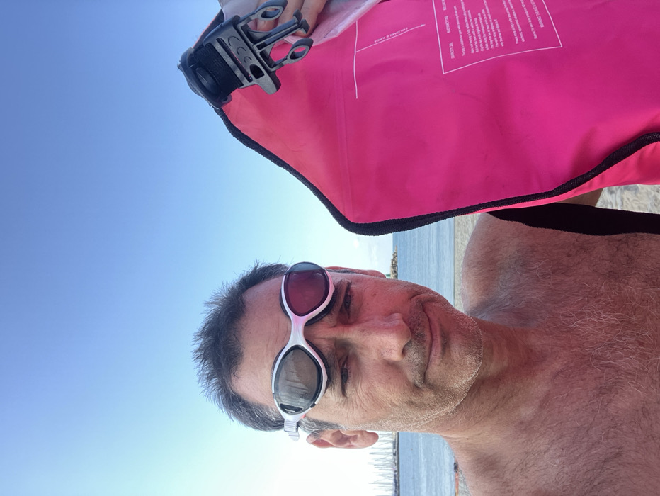 A shirtless male subject, appearing middle-aged, is depicted in a selfie on a sandy beach