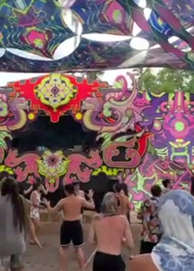 lively outdoor party with a crowd of people dancing under a colorful, patterned canopy. Most people are dressed casually, with many shirtless. The stage is decorated with psychedelic, abstract designs in neon colors. The ground is uneven, possibly dirt or gravel. People are moving around and socializing, fully immersed in the music and the vibrant atmosphere of the event.