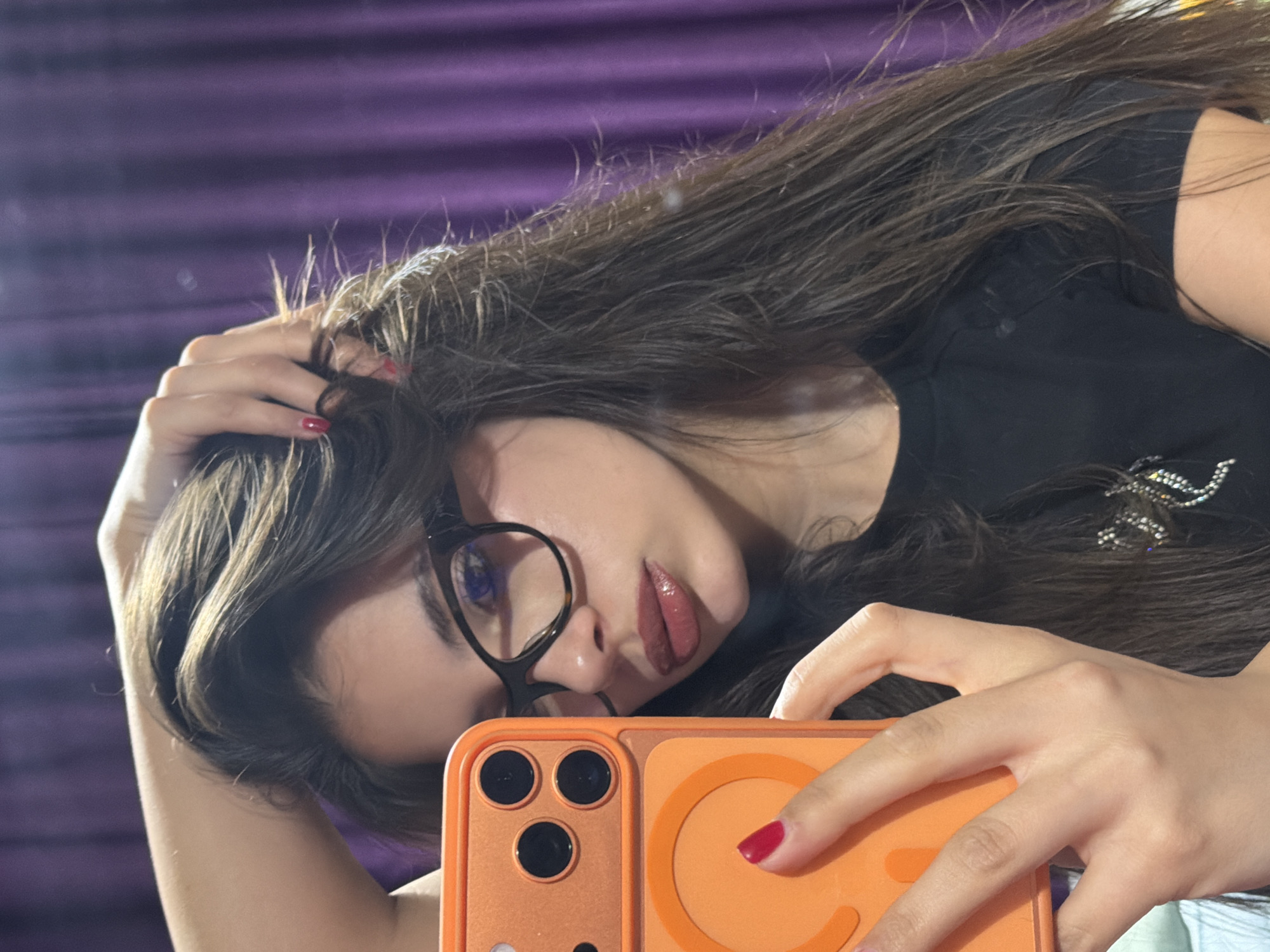 A young woman with long brown hair, wearing glasses and a black t-shirt with a sparkly design, is taking a selfie. She holds an orange phone in her right hand. Her left hand is partially visible, positioned in her hair. She is leaning at an angle. A purple curtain or backdrop is partially visible behind her. The location is not discernible as Dragichevo, Bulgaria based on the provided image content.
