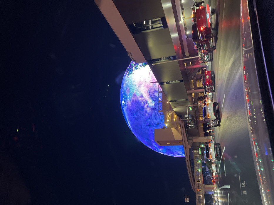 This image captures a nighttime urban scene in Paradise, Nevada, United States, from the interior perspective of a vehicle. The prominent subject is the massive, illuminated MSG Sphere in the background, displaying a dynamic, multi-colored cosmic or planetary image composed of blues, purples, and whites. In the mid-ground, a multi-lane road is busy with vehicular traffic. Numerous cars, SUVs (including a white Tesla Model Y), and at least one red pickup truck are visible, with their headlights and taillights illuminated. Some vehicles appear to be in motion, while others are potentially stopped at an intersection marked by traffic lights; a green light is visible on the left. Orange traffic cones are present on the right side of the road, possibly indicating a temporary lane configuration. Elevated pedestrian walkways and multi-story urban buildings with illuminated windows and exterior lighting are situated between the road and the Sphere. Several individuals are discernible on these elevated structures and near the vehicles on the street level. The foreground shows the dashboard and windshield reflections of the capturing vehicle, including a digital display showing "18" on the lower-left. The overall environment is brightly lit by artificial sources, creating a vibrant city atmosphere.