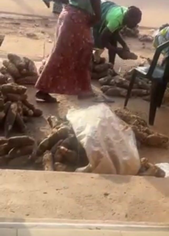 street scene with at least two people selling yams from piles on the ground. One woman wears a green top and is bent over sorting through the yams. Another woman in a red skirt stands nearby. There are multiple piles of yams, and a plastic bag filled with what appears to be yam scraps. People walk in the background. The scene is outdoors, on a dirt and concrete surface, in what looks like a market area. A chair is visible near the woman in the red skirt.