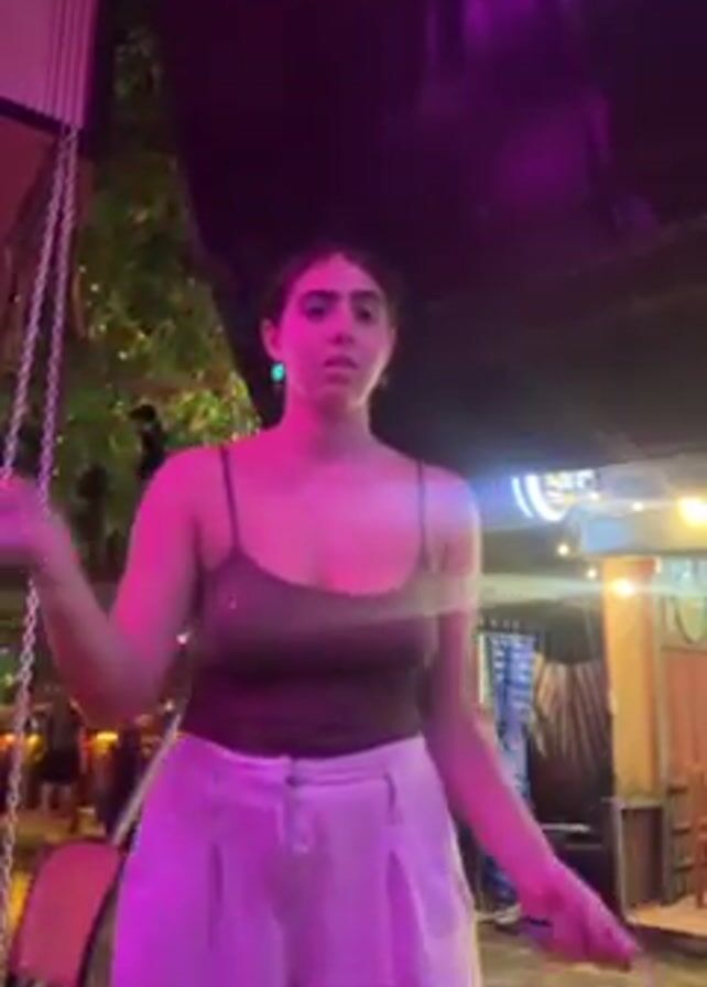 A young woman is dancing in an outdoor setting, possibly a bar or restaurant, with purple and blue lighting. She is wearing a dark-colored tank top and light-colored high-waisted pants. She appears to be gesturing and moving her arms in a rhythmic fashion. There are metal chains visible on the left, and in the background, there are tables, chairs, and other people. The overall atmosphere seems lively and energetic.