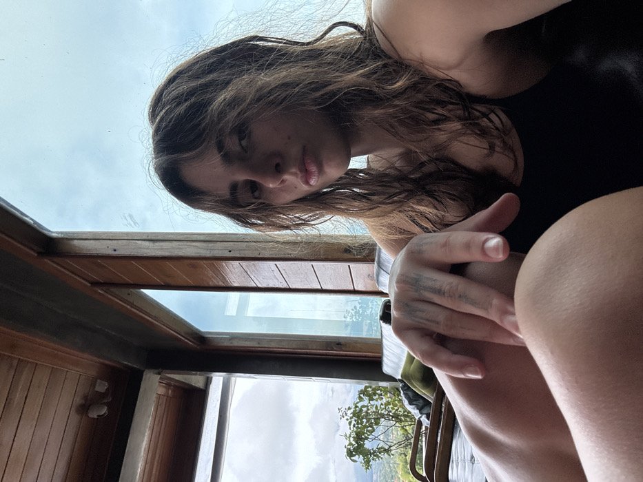 A woman with long, wavy brown hair, wearing a black top, looks at the camera. She is positioned in front of a window, with a view of a cloudy sky and greenery. Her hand is prominently displayed in the foreground, with dark streaks that may be tattoos or markings. The scene is indoors, possibly a wooden cabin or building, as suggested by the interior paneling and window frame.