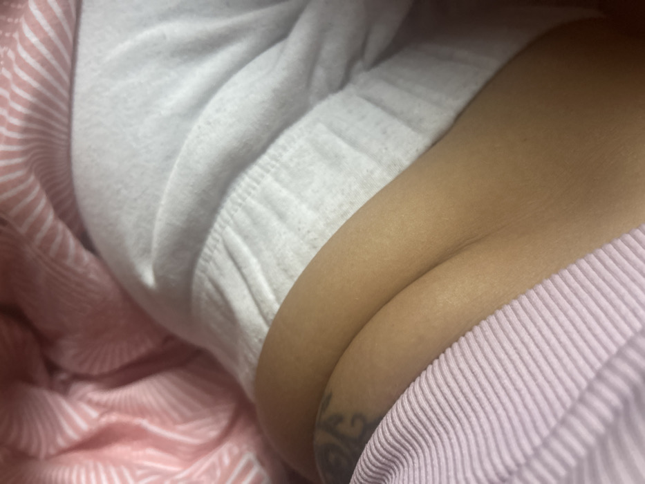 The image displays a close-up, top-down perspective of a human torso and limbs, situated indoors. The stated location is Incarville, France, though no environmental details confirming this are visually present within the frame. A person, exhibiting medium-brown skin, is seen in a reclined or resting position, with a bent limb (consistent with an elbow or knee joint) prominently featured. A dark, tribal-style tattoo is present on the visible skin of the upper left portion of this limb. The subject is partially clad in a light pink, ribbed fabric, visible in the lower left, and a white, textured fabric garment, likely casual wear or sleepwear, covering the mid-right area. This white garment shows faint horizontal seam lines. A pink and white striped textile, consistent with a duvet or sheet, occupies the upper left background.