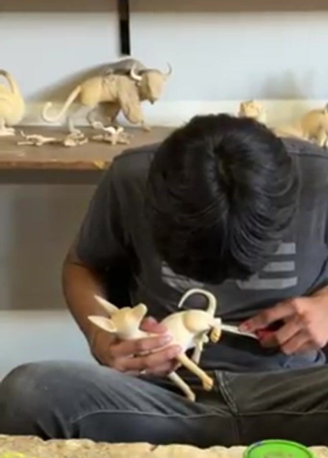 . A man is shown carving a wooden figure of a dog with a carving knife. He is sitting at a work table that has several paints and other small items on it. Behind the man on a shelf are multiple wooden figures of animals and human skulls. The man is wearing a gray tee shirt and gray jeans. He has dark hair. The figure of the dog is light colored wood. The man is focused intently on the carving process.