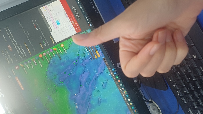 A person's hand points toward a laptop screen displaying a weather map