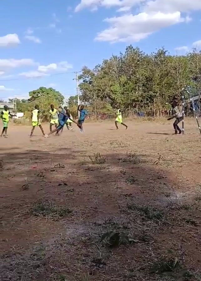 soccer game being played on a dirt field