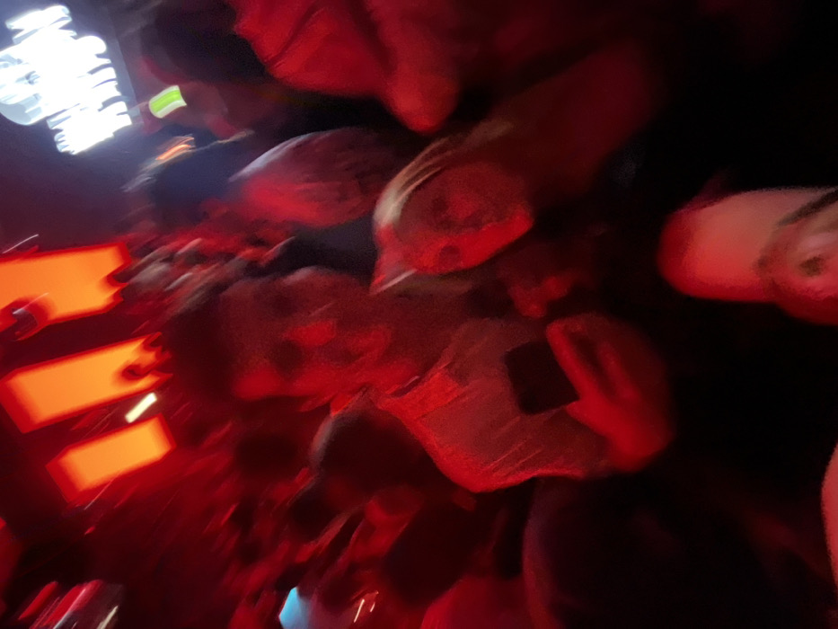 The image depicts an indoor, crowded nightclub scene, identified by visible signage as MAIN CLUB LISBON, located at Rua da Cintura do Porto a Santos, Armazém A, Nº22, 1200-109 Lisbon, Portugal. The environment is saturated with a dominant red light, originating from overhead rectangular lighting fixtures visible in the background. In the foreground, a male individual with dark hair, wearing a light-colored collared shirt, holds a dark-colored smartphone in his left hand. He is positioned slightly left of center and appears to be looking towards the camera. To his right, a female with light-colored hair is partially visible, also directing her gaze towards the camera. Both individuals display slight facial expressions. The background is significantly blurred, populated by numerous indistinct figures, indicating a crowded setting. One figure in the mid-background displays a fluorescent green wristband. The tip of a light-colored shoe is visible at the bottom center of the frame.