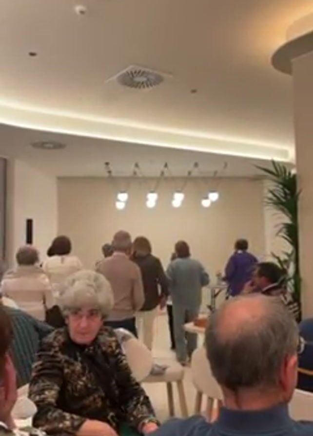 group of older adults dancing together in a brightly lit room. Some are seated, watching the others dance. The room has a modern aesthetic with light-colored walls, modern lighting fixtures, and potted plants. The dancers are dressed casually and appear to be enjoying themselves. Those seated are in small groups around tables, engaged in conversation.