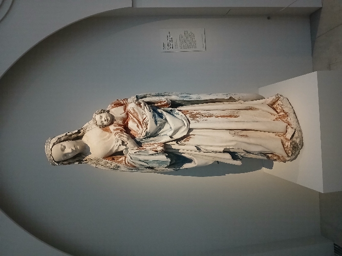 - "A polychrome wooden statue depicting the Virgin Mary holding the Christ Child is displayed on an off-white, rectangular pedestal within a museum gallery in Lens, France" by FM-4kXs22, licensed under CC BY 4.0