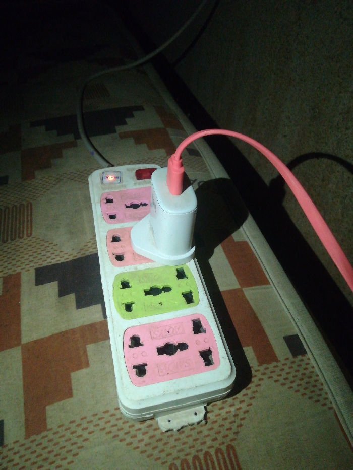 A white extension cord sits on a patterned surface. A white phone charger is plugged into the top outlet, connected to a pink cord. The extension cord has three additional outlets below, colored pink and green. The surface beneath the cord has a pattern of brown, black, and beige shapes. The image is dimly lit, casting shadows. A white cable runs from the top left of the image.