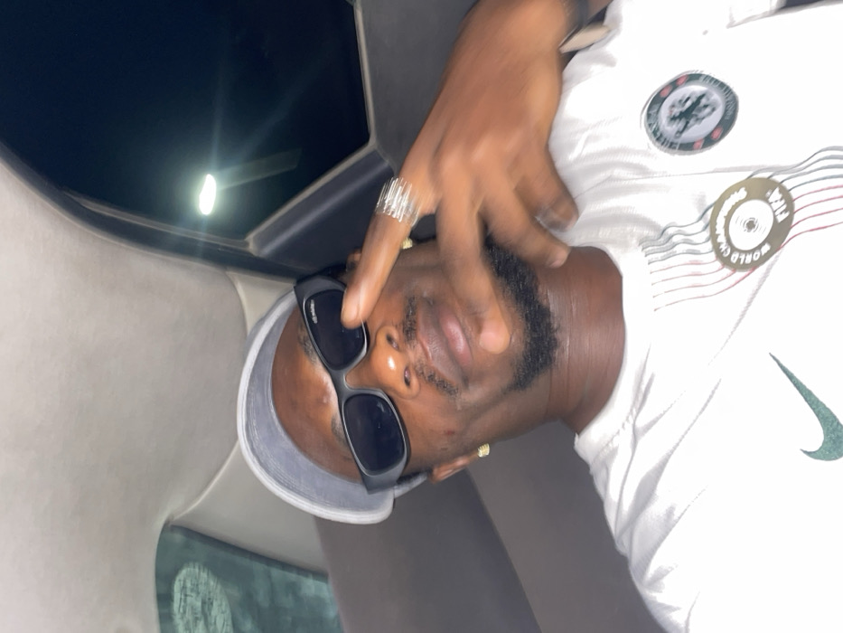 A man in sunglasses and a cap sits inside a car. He wears a white shirt with round badges and a green Nike logo. The man is holding his hand near his face, showing off a silver ring on his finger. The car interior is light-colored. A window is visible with a light source outside. The photograph's orientation is rotated ninety degrees.