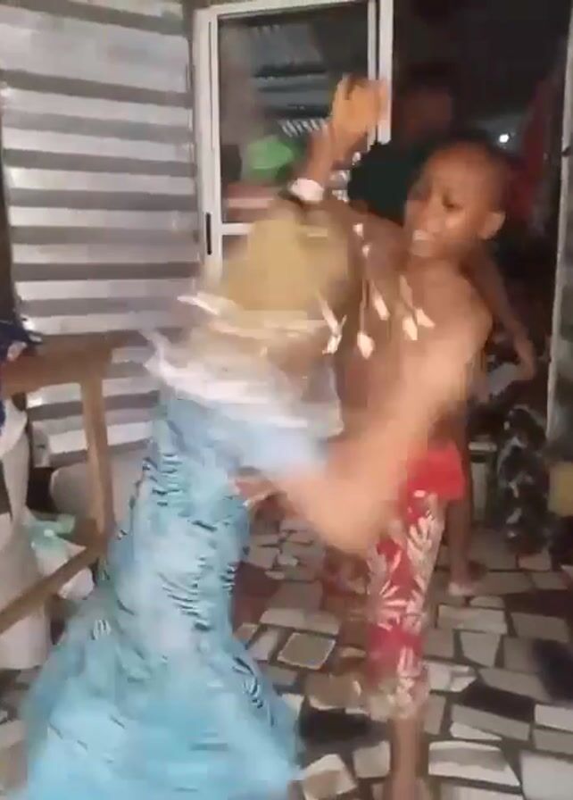 Two children, a girl wearing a light blue dress and a boy who is shirtless and wearing red patterned shorts, are dancing in an indoor space. The girl has her hair styled with blonde braids. The boy occasionally puts his arm around her as they move. In the background, an adult woman wearing a green dress stands near a sliding glass door. The room has a tiled floor and the walls are lined with corrugated metal. There is a small wooden table with items on it to the side. The scene appears to be lively and casual.