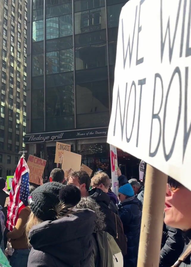 crowd of people marching in a protest in a city. Many are holding signs with political messages. The signs say things like "We Will Not Bow", "Stop Trump Save Democracy", "No Pedo Maga Clown Kings!", "Fascism Threat Level: Orange", and "Congress". The American flag is visible in the crowd. The people are walking on a city street lined with tall buildings. The Hedeye Grill restaurant is visible in the background. Some people are taking photos of the protest. The day appears to be sunny.
