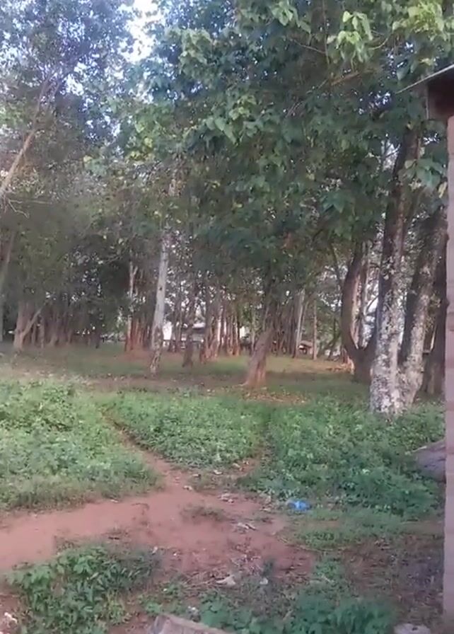 wooded area with numerous trees. The trees have sparse leaves and thin trunks, appearing somewhat uniformly spaced. Ground vegetation consists primarily of low-lying green plants, mixed with patches of bare reddish-brown soil. A tree stump and trash is located in the foreground. In the distance, a building is vaguely visible through the trees. The camera pans up slightly, focusing more on the tree canopy. The sky is overcast.
