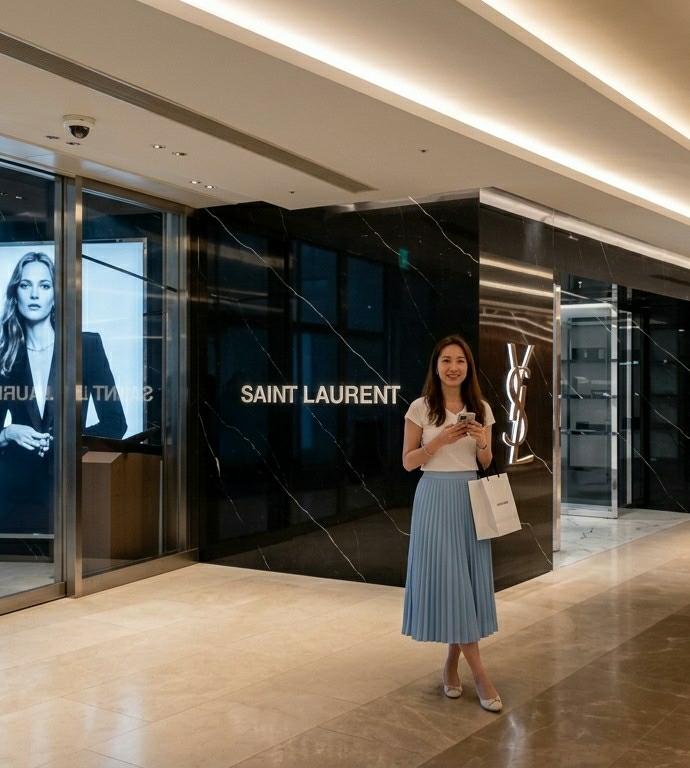 - "A woman stands posing inside a Saint Laurent luxury retail store, located in Chuo, Japan" by FM-g4ca33, licensed under CC BY 4.0
