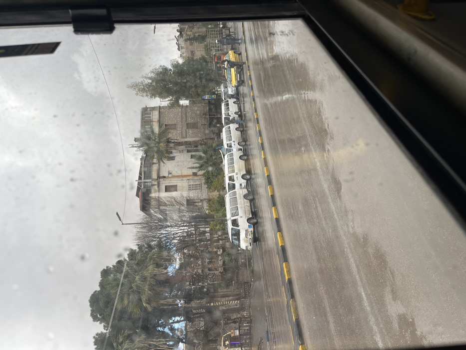 A street scene observed through a window with raindrops. A line of white vans parks along a wet road marked by a yellow and black curb. The architecture includes stone buildings with trees interspersed. The overcast sky creates a muted color palette. A yellow taxi is visible further down the street.