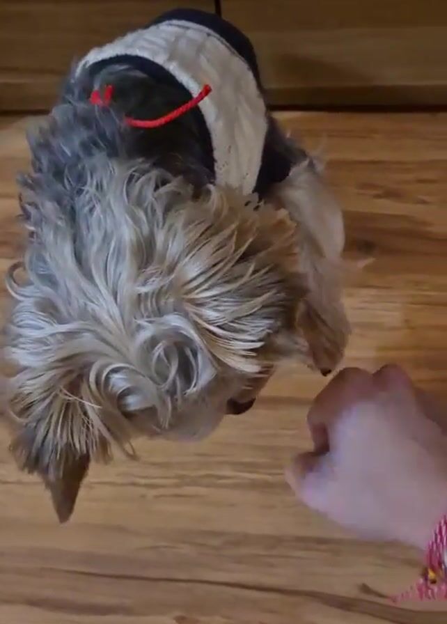 A person holds a small dog. The dog is a Yorkie wearing a small black and white harness with a red string. The dog licks the person's hand, and the person lets go. The dog stands on a wooden floor. The person is wearing a red and white string bracelet.