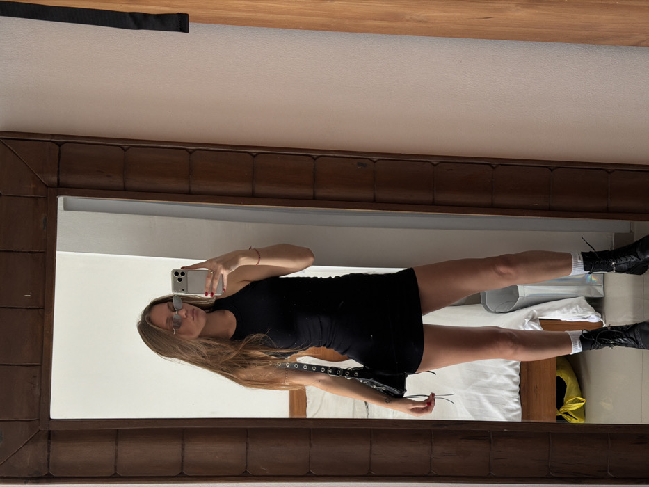 A forensic examination of the image reveals a female individual reflected in a full-length, dark wood-framed mirror, located indoors in Tibubeneng, Indonesia. The subject, appearing to be in her twenties with long brown hair, is positioned frontally to the mirror. She wears small, rectangular silver-framed sunglasses, a fitted black sleeveless mini-dress, black combat boots, and white ankle socks. A black shoulder bag with silver stud accents is suspended from her left shoulder. She holds a light-colored smartphone with red-painted nails on her right hand, suggesting she is actively capturing her reflection. Her lips are slightly pursed. The reflected background includes a bed with white linens and a light-colored wooden frame to the left, a light cream-colored wall, and a partial view of a white, possibly fabric, storage bin or laundry hamper, along with a yellow soft bag on the floor. To the right, a vertical section of a lighter wood door or panel is visible.
