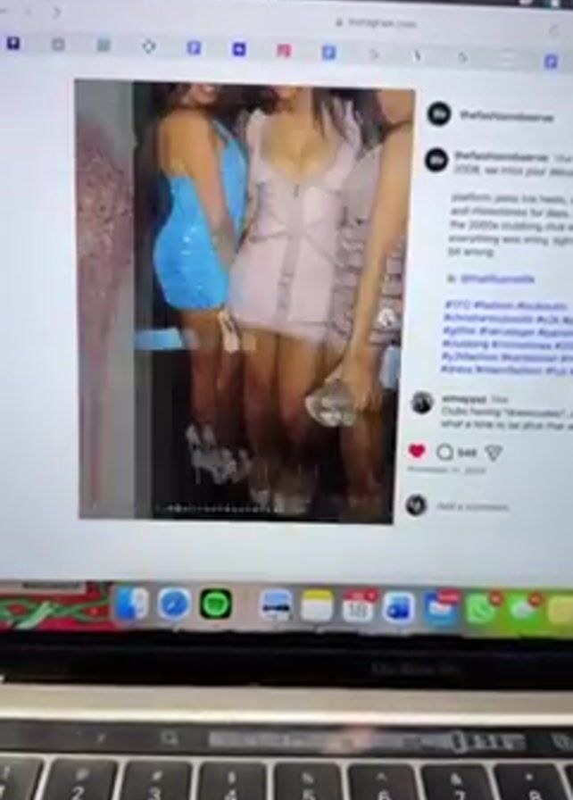 Here is a detailed description of the video: The video shows a person scrolling through an Instagram account on a MacBook Pro laptop. The Instagram account, "@thefashionobserve", posts content related to early 2000s fashion, specifically clubbing attire. The person scrolls through photos of platform heels, mini dresses, and celebrities from that era. Background voices can be heard, indicating other people are present.