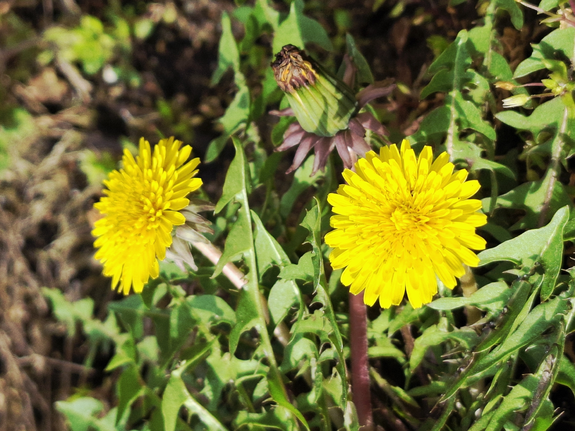 close-up view of two yellow dandelions and one unopened dandelion bud growing amidst green leaves. The background appears to be soil and other vegetation. The location is unspecified.