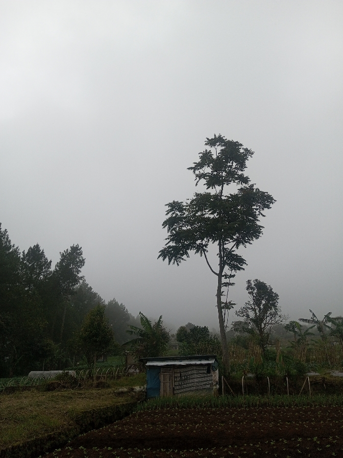 The image depicts a rural agricultural landscape in Irupalai, Sri Lanka, under overcast or foggy conditions. A uniform light gray sky occupies the upper two-thirds of the frame, indicating heavy atmospheric moisture. In the foreground, tilled brown soil displays young green crop shoots arranged in rows. To the immediate left of the central axis, a small, weathered rectangular shed stands, constructed from corrugated metal and wooden planks, featuring a blue door. Behind the shed, additional cultivated areas are visible, with faint structural elements. A prominent tall, slender tree with dark green foliage stands slightly right of center, its branches extending into the misty sky. To the left, a dense line of dark green conifer trees covers a hillside, partially obscured by the mist. Various other green trees and shrubs, including what appear to be banana plants, are scattered across the midground. No individuals are present, and no actions or interactions are discernible.