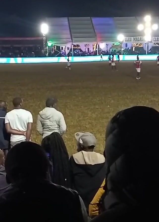 From an audience perspective, the video captures a nighttime soccer match played on a grassy field under bright lights. The field has white boundary lines and several figures in athletic uniforms move around, but they are distant. A large structure with an illuminated screen and other decorations is visible in the background. The viewers, mostly silhouetted, stand or sit watching the game. Some are wearing hoodies, jackets, and hats. There's a general atmosphere of an outdoor event with sports and entertainment.