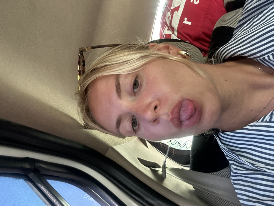 A blonde woman with sunglasses on her head sticks out her tongue at the camera. She is wearing a blue and white striped shirt and has a gold hoop earring. The photo appears to be taken inside a car or RV, with a window visible at the bottom left. A red and black bag rests behind her. The image is rotated counter-clockwise.