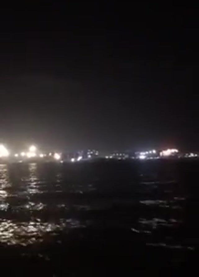 body of water with a hazy, illuminated shoreline in the distance at night. The water is dark, and the lights from the shoreline reflect on the surface, creating a shimmering effect. The sky is dark. At the start of the video, a small part of a person's arm is visible on the left side of the frame. The sound of water is audible.
