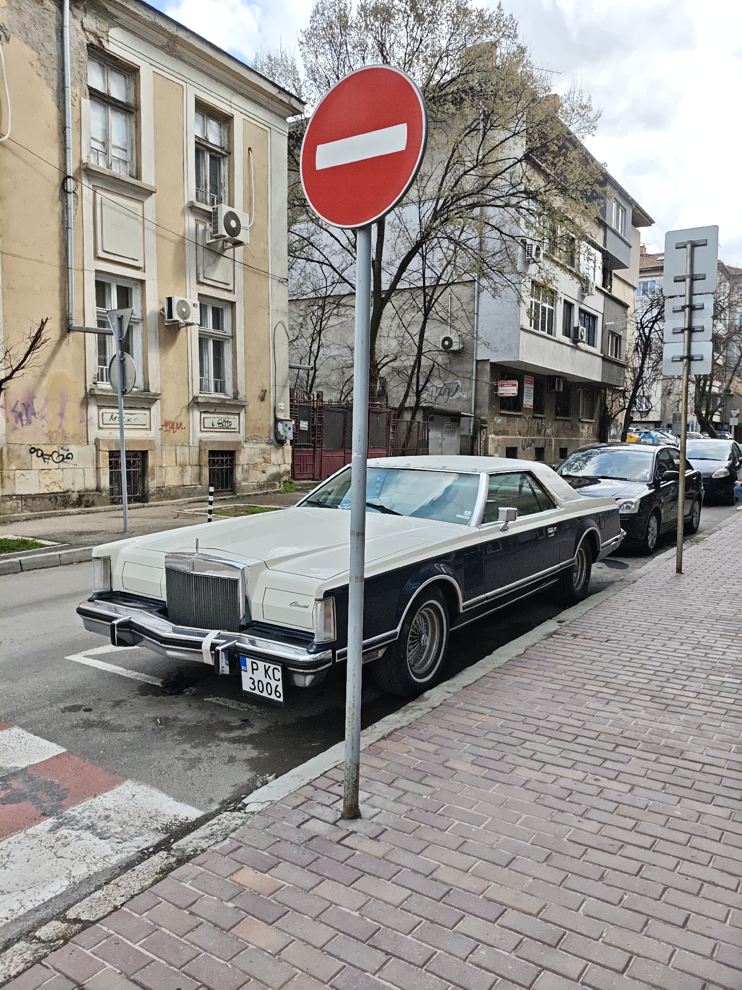 A vintage two-tone (off-white top, dark blue bottom) Lincoln Mark V coupe, bearing Bulgarian license plate "P KC 3006" from Ruse, is parked facing left on the street. The vehicle is positioned alongside a curb on the right, next to a brick-paved sidewalk. A red circular "no entry" traffic sign with a white horizontal bar is prominently displayed on a metal pole in the foreground, partially obscuring the car's roof and the background. The immediate environment shows a faded white and red crosswalk marking on the asphalt road directly in front of the Lincoln. Behind the Lincoln, three other vehicles are parked in a line: a dark sedan, followed by two more cars. On the left side of the street, an old, light yellow stucco building with multiple windows and white trim is visible. It features several externally mounted air conditioning units, exposed wiring, and faded graffiti on its lower walls, including the word "Магазин" (Shop) and "Кафе" (Cafe) in Cyrillic script above ground-level barred windows. On the right side of the street, behind the traffic sign, stands a multi-story, light grey residential building with numerous windows and balconies. Several bare-branched trees, showing early signs of spring foliage, are interspersed between the buildings and the street. The sky is overcast. No people are visible in the scene. The overall setting is an urban streetscape in Ruse, Bulgaria.