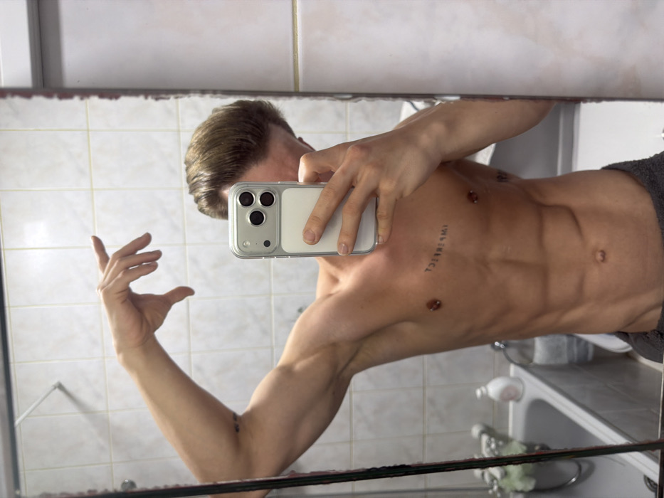 - "A mirror selfie captures a person, likely male, shirtless and clad in a dark towel from the waist down, within a bathroom located in Viseu, Portugal" by FM-YfKzI3, licensed under CC BY 4.0