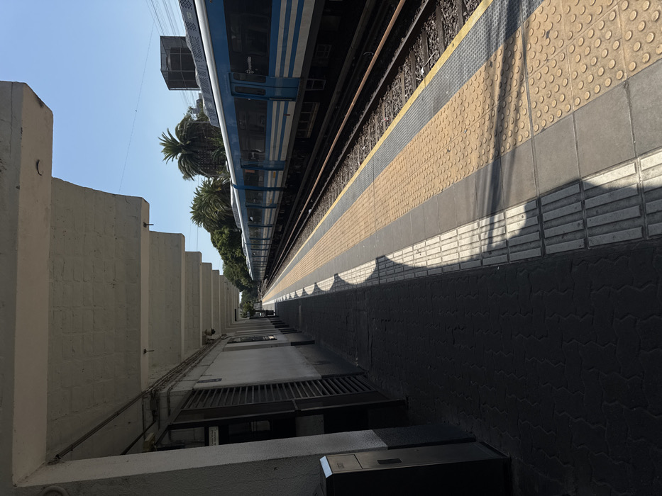 A train sits at a station platform. The platform features tactile paving in yellow. The platform edge has shadows creating a scalloped effect. The left shows a concrete wall structure with vents, adding depth. The train's carriages are visible in blue and white. The scene is bathed in sunlight with clear skies above. The angle is a diagonal viewpoint along the platform.