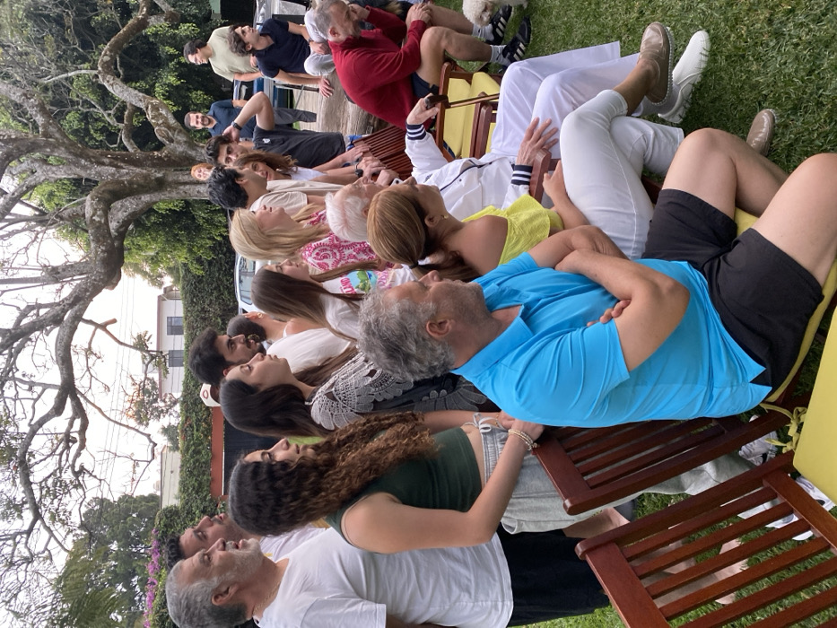 A gathering of approximately 20 people outdoors, possibly in a yard. They are seated in chairs or on the ground, facing upwards. The group's attire is casual and diverse, including bright colors, white, and black. A large tree is visible on the left, with a house and green hedge in the background. The scene appears to be a relaxed, communal event.